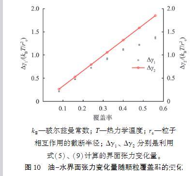 图10油-水界面张力变化量随颗粒覆盖率的变化第二种方法是考虑所有因素对界面张力的影响,利用式(5)计算界面张力的变化Δγ1,如图10中的黑点所示,黑点中的误差棒是独立计算多次结果得到的误差。随着颗粒覆盖率的增加,界面张力降幅增大。Δγ1和Δγ2的变化趋势是一致的,都是随着界面覆盖率的增大,界面张力降幅增大。在覆盖率较小时,由于颗粒数量较少,在界面分布较为稀疏,使得颗粒间相互作用不明显,因此颗粒间相互作用对界面张力的计算没有太大的影响,Δγ1和Δγ2变化趋势基本一致。随着覆盖率的增大,Δγ2>Δγ1。由于直接利用吸附能和吸附颗粒数量计算界面张力存在明显的局限性,因此接下来要进一步研究颗粒间相互作用对界面张力的影响。