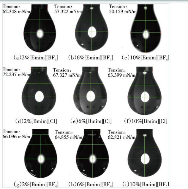 1)表面张力测试。在室温为25℃的环境中,利用电子天平将[Emim][BF4]、[Bmim][Cl]、[Bmim][BF4]分别配制质量分数为0.6%、0.7%、0.8%、0.9%、1%、2%、3%、4%、5%、6%、7%、8%、9%、10%的活性水溶液,测定不同质量分数下离子液体溶液的表面张力3次,取平均值。