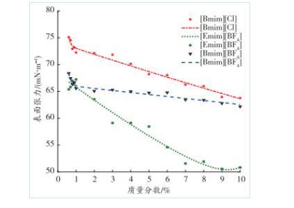 2)在离子液体质量分数继续增大到一定阶段后,表面张力逐渐趋于稳定。这是由于当质量分数继续增大到一定值时,阴阳离子形成胶束,此时质量分数增大对表面张力的影响较小。分析得出3种离子液体单一溶液对降低表面张力的能力大小为[Emim][BF4]>[Bmim][BF4]>[Bmim][Cl]。