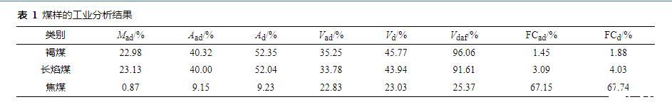 选取不同变质程度的褐煤、焦煤及长焰煤,将煤样放入球磨机中粉碎,并通过筛网过滤出粒径在0.074 mm(200目)以上的煤粉,置于45℃真空干燥箱中干燥24 h后放入密封袋中低温、避光保存。利用全自动工业分析测定仪对3种煤样的水分、灰分和挥发分进行测定,计算固定碳,其工业分析结果如表1所示。