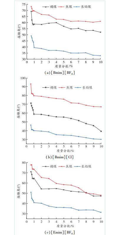 对于光滑的煤样,离子液体对煤样的润湿程度采用接触角作为评价指标。3种煤样的接触角与不同离子液体质量分数之间的关系如图3所示。