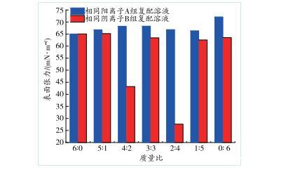 不同复配质量比下A、B 2组复配溶液的表面张力变化情况如图5所示。