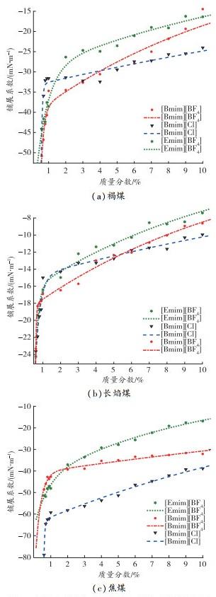 2)3种咪唑类离子液体的铺展系数随离子液体质量分数的增大而迅速增大,长焰煤的亲水能力最好,而焦煤的亲水能力最差,这与煤中亲水基团和疏水基团的含量有关;