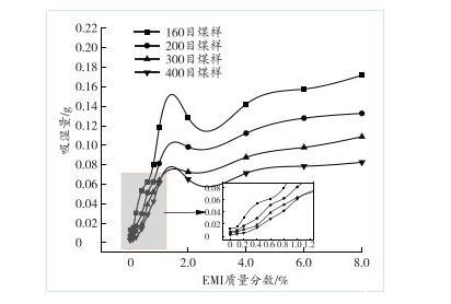 由图6可知,4组测试煤样对纯水的吸湿量均较低,当加入EMI溶液后,随着加入溶液中EMI质量分数的增大,4组测试煤样的吸湿量均普遍升高。当溶液中EMI质量分数达到8.0%时,160目测试煤尘的吸湿量为0.170 4 g,吸湿量相比于纯水增大12.8倍;200目测试煤样煤尘的吸湿量为0.135 2 g,是纯水条件下的17.1倍;质量分数低的EMI溶液对300目测试煤样的影响较小,当溶液中EMI质量分数达到8.0%时,吸湿量为0.104 9 g,相比于纯水条件下,吸湿量增大了19.8倍;400目测试煤样受EMI溶液的影响最大,随着溶液中EMI分子的质量分数增大,煤尘的吸湿量持续增大,当溶液中EMI的质量分数达到8.0%时,煤尘的吸湿量为0.083 5 g,相比于纯水条件下的吸湿量增大28.8倍,润湿性提升最为明显。