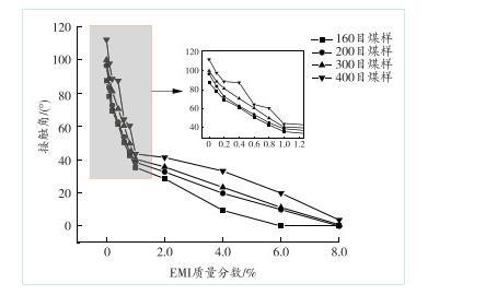 由图5可知,针对160目测试煤样,溶液中EMI质量分数大于2.0%后,接触角的减小率更高,当溶液中EMI质量分数为6.0%时,接触角为0°,煤样被快速润湿,达到完全润湿状态。EMI质量分数相同时,200目与300目测试煤样的变化趋势大致相同。200目测试煤样在EMI质量分数小于1.0%的溶液时,接触角呈线性减小趋势,当大于1.0%后,接触角减小率出现先逐渐变缓而后逐渐增大的细微波动;300目测试煤样在EMI质量分数为0.1%~0.6%时,接触角减小率出现细微波动,呈先变缓后逐步增大的趋势;当溶液中EMI质量分数达到8.0%时,两组测试煤样均达到完全润湿状态,接触角为0°。而400目测试煤样的煤尘粒径最小,煤样的润湿性较弱,当溶液中EMI质量分数为0.8%~2.0%时,接触角减小率呈先逐渐增大而后逐渐变缓的趋势;当溶液中EMI质量分数大于2.0%时,接触角的减小率呈线性降低趋势;当溶液中EMI质量分数达到8.0%时,煤样还未达到完全润湿状态。