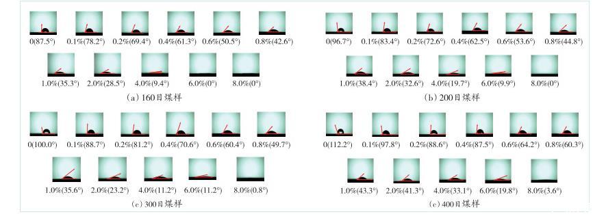 接触角是指在气、液、固三相交界处的气—液界面和固—液界面之间的夹角。接触角作为测试液体对固体润湿效果的重要参数,对测试煤尘的润湿性具有重要作用,接触角越小,液体对固体的润湿效果越强。利用接触角测量仪,对液滴与测试煤样之间的接触角进行成像,如图4所示(图像从左到右,溶液中EMI质量分数逐渐增大)。由图4可知,随着煤样粒径的减小,4种煤样与液滴之间的接触角均逐渐增大。当加入EMI溶液后,4种煤样的接触角随溶液中EMI质量分数增大而变化的趋势大致相同,均呈现出逐渐减小的趋势,表面疏水性减弱,煤尘润湿性增强。