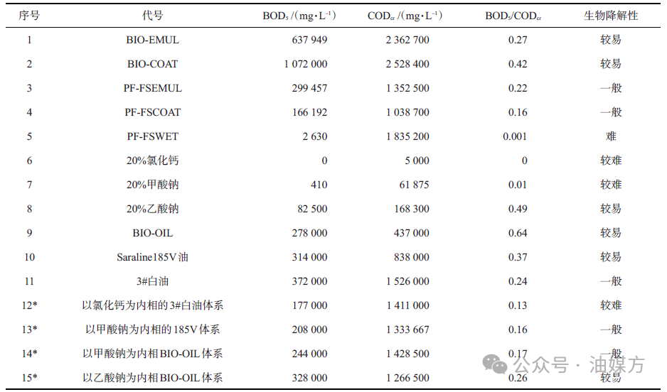 表1降解性数据注:标*的样品配方为:240 mL基液+20 g/L BIO-EMUL+15 g/L BIO-COAT+60 mL内相盐溶液。