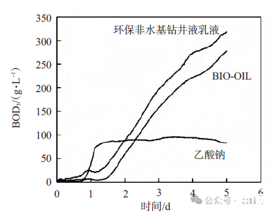 图1 BIO-OIL、乙酸钠溶液、环保非水基钻井液乳液BOD5随测试时间的变化