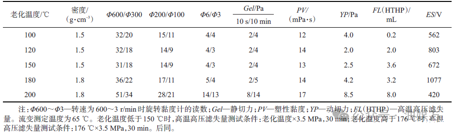 利用重晶石对钻井液的密度进行调节,评价不同密度条件下体系的综合性能,结果见表3。由表3可见,构建的环保非水基钻井液在120~180℃范围内具有较好的稳定性,密度为1.8g/cm3时,钻井液体系破乳电压在1000V以上,体系具有良好的流变性及高温高压滤失量。但是当老化温度高于200℃后,钻井液的黏度明显增加,高温高压滤失量变大。这可能是因为BIO-EMUL与BIO-COAT属于脂肪酸及其酯类衍生物表面活性剂,高温造成了表面活性剂的降解及油/水界面的解吸附。