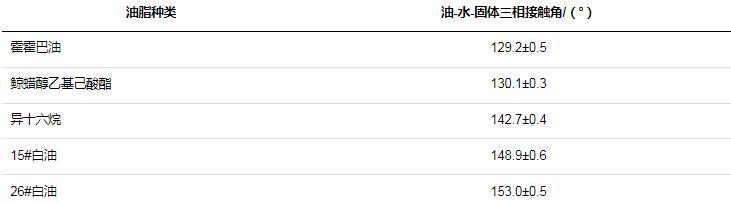 以不同极性的油脂为油相制备了一系列的Pickering乳液,图2是不同油脂得到的W/O型Pickering乳液的表观照片、微观图像及粒径分布图,可以看出,不同油脂得到的Pickering乳液粒径具有较大的差异,粒径大小顺序为霍霍巴油(5.45μm)<鲸蜡醇乙基己酸酯(8.66μm)<异十六烷(17.46μm)<15#白油(18.20μm)<26#白油(24.53μm),极性油脂制备的Pickering乳液的粒径较小,且极性越大,Pickering乳液的粒径越小,而非极性油脂制备出的乳液的粒径较大,这是由于油相的极性会影响油-水-固体三相接触角(见表1),油相的极性越大,油-水-固体三相接触角越接近于90°,乳液的粒径越小。