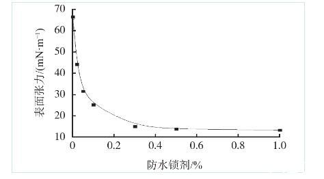 室温下,3%NaCl盐水溶液中分别加入不同浓度的防水锁剂FS-1,评价FS-1加量对盐水溶液表面张力的影响。