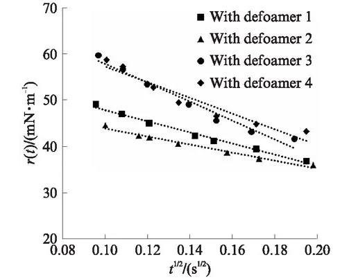 扩散系数是指单位时间内物质通过单位扩散通道横截面的质量。扩散系数越大,物质扩散能力越强。利用拟合曲线斜率代入式(1),可以求得消泡剂在起泡液中极短时间范围的扩散系数,消泡剂1、2、3、4的扩散系数D分别为4.67×10-6、2.43×10-6、1.33×10-5、9.24×10-6m2/s,在10-5到10-6数量级。