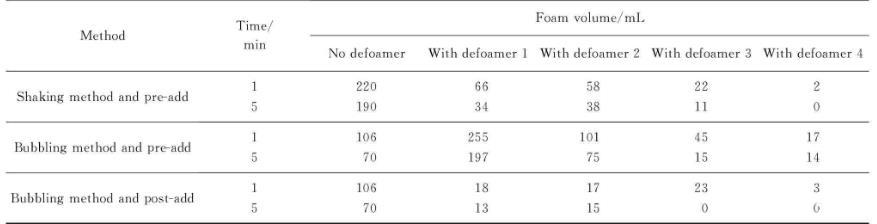 用鼓气法研究了不同的消泡剂添加方式,由表1可以发现后添加方式比先添加方式的初始泡沫明显降低。后添加方式的消泡剂大量聚集于泡沫表面,破坏了气液界面的平衡。虽然在实际生产过程中以先添加方式为主,但试验结果给出了制备工艺改进的思路。