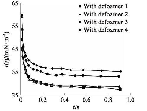 图1是添加消泡剂后起泡液(0.2%二异辛基琥珀磺酸钠盐水溶液)的动态表面张力r(t)与时间t的关系图。由图1可以看出:在同样的添加量下,分子级消泡剂(消泡剂1、2)可使起泡液具有更低的动态表面张力,这与其双子结构有关;有机消泡剂(消泡剂3、4)在起泡物质的协同作用下,也具有一定的降低起泡液动态表面张力的能力;在起泡液中,不论是加入分子级消泡剂还是有机消泡剂,在时间趋于1s时,其表面张力都低于36mN/m.
