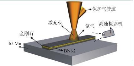 前期开展了激光钎涂金刚石技术研究,分析了激光功率和扫描速率对涂层微观组织与力学性能的影响。从现有研究来看,已有的激光钎涂金刚石研究大多数集中于金刚石/钎料合金界面的组织演变和单层金刚石工具的机械加工性能方面,在钎涂层的成形过程方面尚未进行深入的研究工作。前期研究发现,在激光钎涂金刚石过程中,金刚石易于向表面聚集,这对涂层的整体性能提升将会产生极大的影响,因此需要针对涂层的成形行为及其机理方面进行深入的研究,进一步提升涂层的耐磨性能。文中采用BNi-2合金作为钎料,利用光纤激光在65Mn钢基体上制备金刚石涂层,并利用高速摄影技术观察金刚石激光钎涂过程中,镍基粉末形成涂层和金刚石迁移全过程,分析钎涂层的成形行为及其机理,并讨论激光钎涂金刚石的能量转换与传递路径,以期为激光钎涂金刚石的工程应用提供数据支撑。