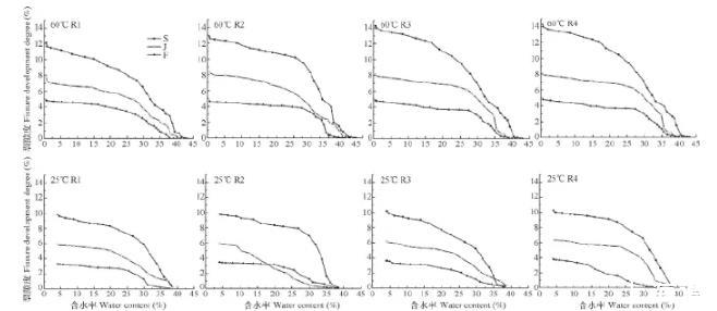 图3给出了三种试样四次脱湿循环在不同温度条件下裂隙度随脱湿含水率的变化。同一土样,相同含水率情况下,裂隙度随着干湿循环次数的增加而增大,而相同裂隙度对应的含水率也随循环次数