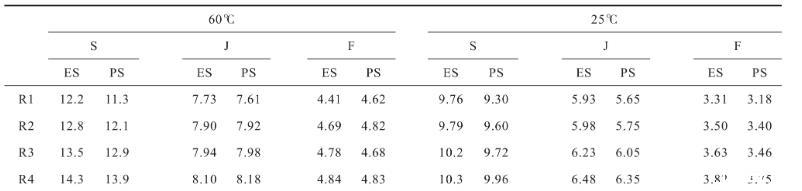 表2为三种试样最终收缩开裂裂隙度的相关研究结果。从表2可以看出,同组试验各平行样的最终收缩开裂裂隙度基本一致,说明该试验具有良好的可重复性。60℃条件下纯水(S样)的四次干湿循环最终平均δ分别为11.8%、12.4%、13.2%、14.1%,酒精溶液(J样)分别为7.7%、7.9%、8.0%、8.1%,肥皂水(F样)分别为4.5%、4.6%、4.7%、4.8%;25℃条件下S样的四次干湿循环最终平均δ则分别为9.5%、9.6%、9.9%、10.1%,J样分别为5.8%、5.9%、6.1%、6.4%,F样分别为3.2%、3.4%、3.5%、3.7%。可见,在同种温度条件下,同组试样的最终δ随着干湿循环次数的增加而增大;而在不同温度条件下,同组试样的最终δ同样随温度的增加而增加,取第四次循环来看,60℃条件下的纯水、酒精溶液和肥皂水试样的最终δ分别较25℃条件下的高4.0%、1.7%和1.1%。将25℃和60℃条件下的最终δ进行对比,不论何种温度条件下,纯水样的最终δ大于酒精溶液样和肥皂水样的最终δ;其中,酒精溶液样的最终δ大于肥皂水。