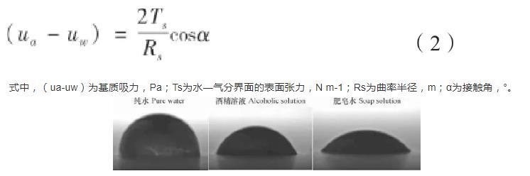 由上式可以看出,基质吸力的大小与表面张力、接触角和曲率半径有关。其中,基质吸力的大小与表面张力成正比,与弯液面曲率半径成反比。因此,表面张力和曲率半径的变化均会导致基质吸力的改变。在环境温度为25℃时,通过JC2000型接触角测量仪对三种试样的孔隙液体进行接触角测量。得到三种不同表面张力液滴的几何形态图如图4所示,测量可得纯水、酒精溶液和肥皂水对应的接触角分别为85°、65°和42°,而在25℃环境下,纯水、20%酒精溶液、2 g L-1肥皂水的表面张力系数分别为:7.1×10-2N m-1、4.1×10-2N m-1、2.9×10-2N m-1。表面张力是决定弯液面形状的主要因素之一,会影响曲率半径和接触角的大小。很显然,表面张力大的液体接触角变大,曲率半径变小。图4中水滴表面张力大于酒精溶液,但形成的弯液面半径却要小于酒精溶液,同样的,酒精溶液形成的弯液面半径又小于肥皂水。曲率半径越小,土体中的基质吸力越大。孔隙水表面张力会对弯液面的曲率半径产生改变从而对基质吸力产生影响,最终影响土壤的收缩开裂。