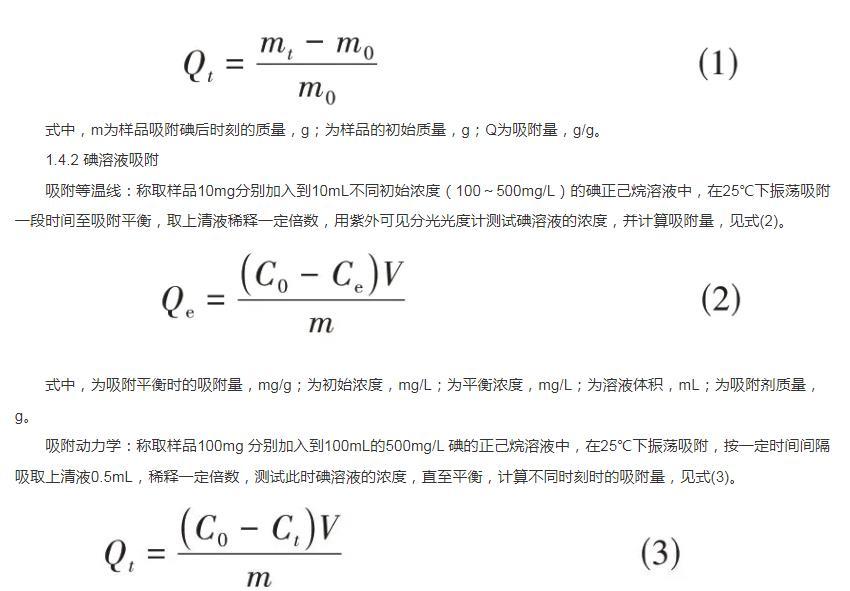 式中,m为样品吸附碘后时刻的质量,g;为样品的初始质量,g;Q为吸附量,g/g。