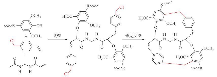 以上文献表明木质素基多孔聚合物作为吸附剂拥有巨大潜力,但目前报道的木质素基聚合物的比表面积仍相对较小,且多为介孔大孔结构,杂原子含量不高,吸附性能仍有待提高。此外,将其应用于放射性碘捕获也很少有文献报道。基于此,本文拟采用多步化学交联策略,即先通过自由基共聚反应接枝一定量的可烷基化或酰基化基团的芳香族单体,且聚合中加入少量含杂原子的双烯单体,使其得到理想的亲疏水性以及充足的碘亲和位点。接着,通过Friedel-Crafts反应使上述内亲电试剂在木质素共聚物的大分子链之间搭建大量由亚甲基等刚性基团形成的交联桥,原位构筑刚性结构支撑的杂原子修饰木质素基超交联聚合物,从而保证其对碘蒸气或碘溶液具有快速的吸附速率、良好的稳定性和高的吸附容量。