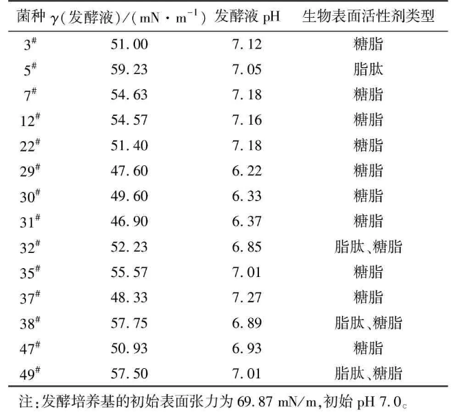 经富集分离共得到49株细菌,初步筛选出14株生长较好的目的菌株接种于发酵培养基。在微生物采油过程中,表面活性剂和有机酸可以把原油从岩层中剥离下来,提高原油流动性。因此,以发酵过程中发酵液的pH和表面张力的降低为指标,对初筛得到的菌株进行复筛,同时分析所产生物表面活性剂的类型,结果见表1。