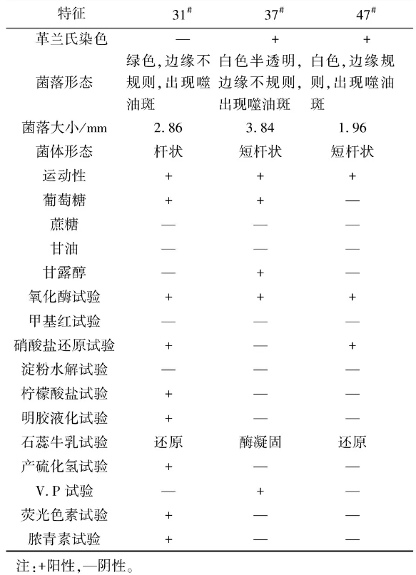 对筛选所得菌株进行常规生理生化特性实验,结果如表2所示。根据表2所示结果和《伯杰氏(Berge)菌种鉴定手册》的描述,可鉴定菌株31#为假单孢属,菌株37#、47#均为芽孢杆菌属。