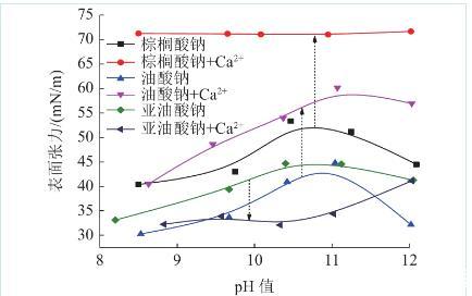应用铂片法对溶液表面张力进行测试,测试前使用乙醇和去离子水对测试玻璃皿进行清洗,直至测定去离子水表面张力为72±0.2 mN/m。通过NaOH调节38 mL CaCl2溶液pH值,2 mL 4×10-3 mol/L脂肪酸钠溶液被添加到CaCl2溶液并搅拌2 min,测量并记录pH值,然后测量溶液表面张力。