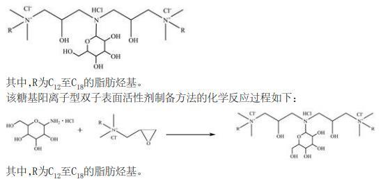 将所需量的2,3-环氧丙基-N,N-二甲基烷基氯化铵和氨基葡萄糖盐酸盐溶于水中,反应后,得到糖基阳离子型双子表面活性剂的水溶液,其中,2,3-环氧丙基-N,N-二甲基烷基氯化铵与氨基葡萄糖盐酸盐的摩尔比为2至2.2:1,2,3-环氧丙基-N,N-二甲基烷基氯化铵与氨基葡萄糖盐酸盐的总质量与水的质量比为1:9。