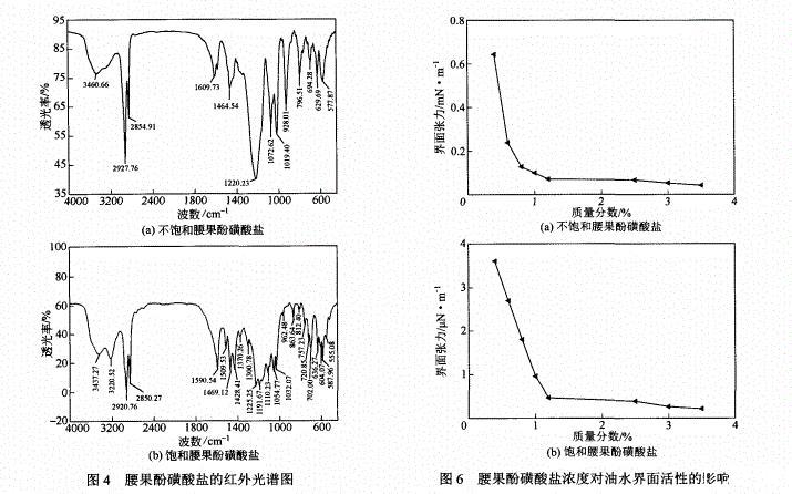 (1)采用生物质腰果酚和饱和腰果酚为原料,通过磺化和中和两步反应合成了两种具有两亲性质的腰果酚磺酸盐。红外光谱表征结果表明,所合成的化合物与理论结构基本相符。
