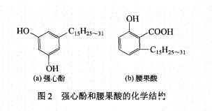 从图1可以看出,两种生物质腰果酚磺酸盐的收率随着反应温度的升高先增加随后变化较缓,而活性物含量先增大后减小。在磺化温度为25℃时,不饱和腰果酚磺酸盐和饱和腰果酚磺酸盐的活性物含量达到最大值,分别为84.0%和98.7%,此时收率也较高,分别为85.0%和88.9%。当磺化温度高于25℃时,两种腰果酚磺酸盐的活性物含量降低,收率变化较小。分析原因可能为,磺化温度太高,会导致过磺化,生成的副产物水溶性较差,导致活性物含量较低。在相同条件下,饱和腰果酚磺酸盐的收率和活性物含量高于不饱和腰果酚磺酸盐,这主要是由于不饱和腰果酚中含有一定量的杂质强心酚和腰果酸,结构见图2。这两种物质的结构与腰果酚的结构相似,分离难度较大;且这两种物质也发生磺化反应,导致不饱和腰果酚磺酸盐的活性物含量较低。然而通过对不饱和腰果酚进行侧链加氢生成饱和腰果酚后,物理性质发生变化,饱和腰果酚为棕色固体,强心酚和腰果酸为液体,很容易分离。因此,饱和腰果酚磺酸盐的活性物含量高于不饱和腰果酚磺酸盐。