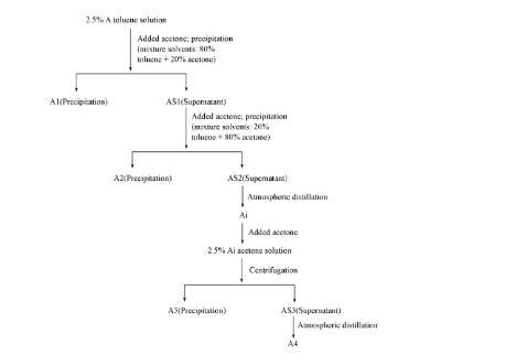 1.2.1沥青质及其亚组分的分离利用正己烷沉淀出原油中的沥青质A.利用混合溶剂(甲苯和丙酮)沉淀法,将A分为4个不同的亚组分,分离流程如Scheme 1所示。首先,制备质量分数为2.5%的A甲苯溶液,作为初始沥青质溶液,然后加入丙酮,将该混合物(甲苯/沥青质/丙酮)静置20 h后,以3500 r/min的转速离心40 min,分别收集沥青质的第1个亚组分A1和上清液AS1.在AS1中继续加入丙酮至浓度为80%,离心沉淀,分别收集沥青质的第2个亚组分A2和上清液AS2.通过常压蒸馏去除AS2中的溶剂,得到沥青质的中间亚组分Ai.将Ai以质量分数为2.5%的浓度溶于丙酮,静置20 h后,离心40 min得到沥青质的第3个亚组分A3和上清液AS3,然后通过常压蒸馏去除AS3中的溶剂得到沥青质的第4个亚组分A4.