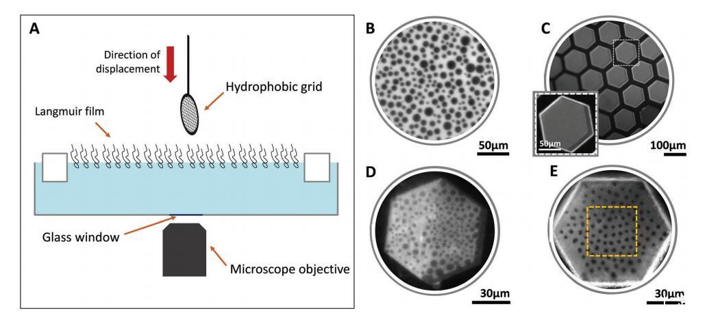 图 1 用于生成和观察朗缪尔单层和平面独立双层的实验装置 (A)。 代表性图像显示 表面压力为 28 mN m 的中性朗缪尔单层膜? 1 (B), 转移后立即包含多个同质双层 (C) 的网格, 和 突出显示的孔(C 中的插图)的放大图,以及显示相共存的中性 (D) 和带电双层 (E)。 橙色虚线方块 (E) 中显示的是用于分析的区域的示例。