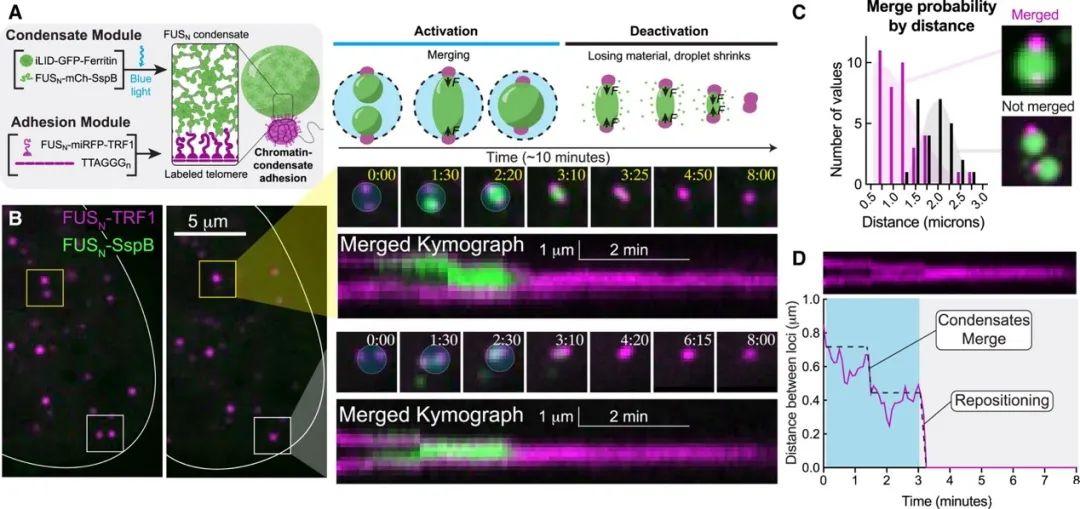 通过局部蓝光激活,凝聚体可以在标记的位点上被诱导形成。在持续光激活下,锚定到两个相邻染色质位点的凝聚体会生长并融合为一个,并与目标位点保持关联。在去激活后,凝聚体收缩产生拉力,导致这些位点重新定位(图1A)。这种方法能使端粒成功地在多个微米的核空间内重新定位。然而,如果位点之间的距离超过2