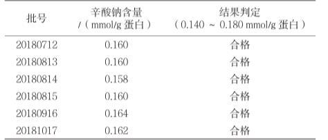 取每1 g蛋白质中含0.130 mmol、0.160 mmol、0.190 mmol辛酸钠的加标回收率溶液作为供试品,每个浓度分别制备3份进行测定,根据标准曲线计算辛酸钠含量。
