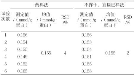 由表3可知,药典方法测得的9次回收率的平均值为97.7%,RSD值为1.70%;不挥干,直接进样法测得的9次回收率的平均值为99.7%,RSD值为1.55%。对两组数据进行单因素方法分析,F=7.530,P=0.02<0.05,两组数据有显著性差异。方法优化后准确度更接近100%,这是因为优化后的方法不受挥干速度的影响[3],进样溶液比药典方法均匀,损失量相对较小。