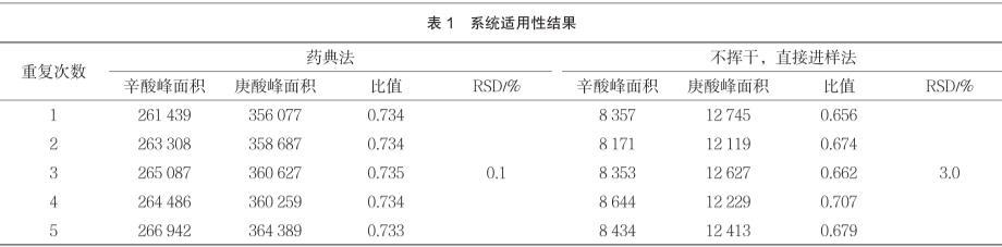 由表1可知,不挥干,直接进样法(优化后的方法)所得峰面积较小,这是因为优化后方法的辛酸对照品溶液不挥发至干,直接进样使得浓度变低,峰面积变小,但不影响积分。连续5针辛酸峰与庚酸峰面积之比的RSD值由药典方法的0.1%变为3.0%,但仍符合系统适用性要求(不大于5%)。实验时间由2 d缩短为1 d。