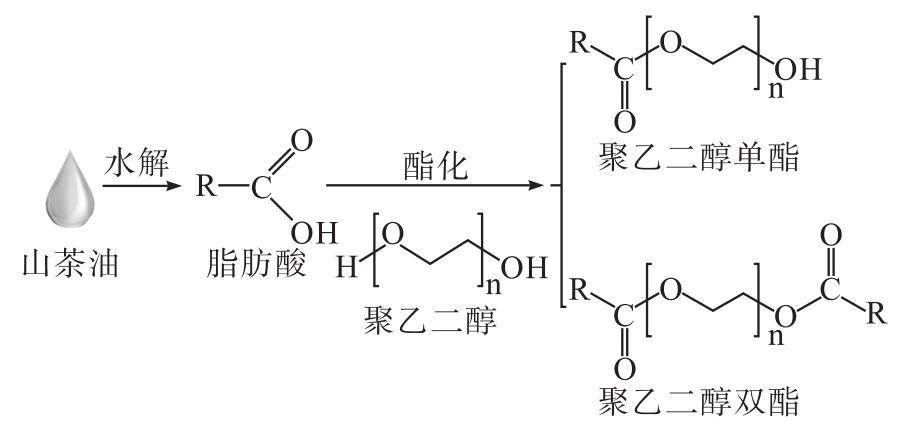为了解决上述问题,本文以聚乙二醇600(PEG600)和山茶油水解产物为原料,通过水解-酯化两步法制备改性山茶油,并对其各项性能指标进行评价,为山茶油在水剂型化妆品中的应用提供数据支持。改性山茶油的制备原理如图1所示。