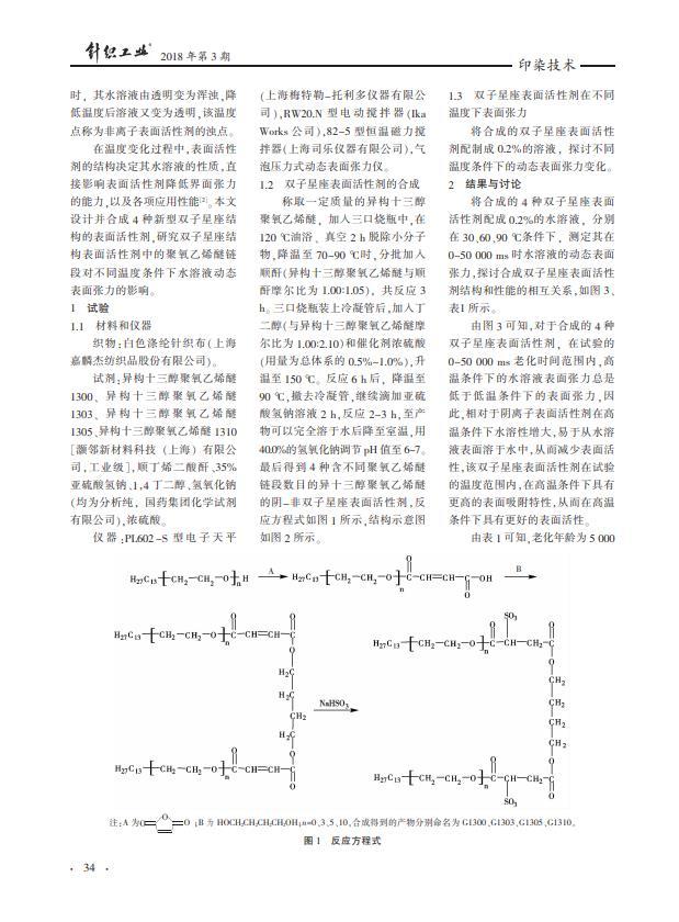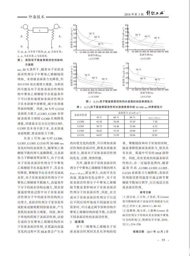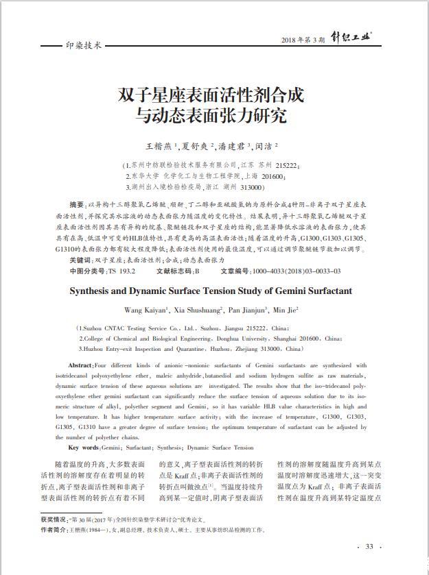 以异构十三醇聚氧乙烯醚、顺酐、丁二醇和亚硫酸氢钠为原料合成4种阴-非离子双子星座表面活性剂,并探究其水溶液的动态表面张力随温度的变化特性。结果表明,异十三醇聚氧乙烯醚双子星座表面活性剂因其具有异构的烷基、聚醚链段和双子星座的结构,能显著降低水溶液的表面张力,使其具有在高、低温中可变的HLB值特性,具有更高的高温表面活性;随着温度的升高,G1300、G1303、G1305、G1310的表面张力都有较大程度降低;表面活性剂使用的最佳温度,可以通过调节聚醚链节数加以调节。