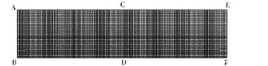 采用聚合物专用流体分析软件Polyflow,对圆形截面的流道进行模拟分析,探讨表面张力的尺寸效应及表面张力系数和接触角对微挤出流场的影响。由于流道结构及流场的对称性,本模拟采用轴对称分析。模拟分析的流道尺寸及网格划分如图2所示。微通道尺寸AE=4×AB=1.2mm。网格采用四边形结构单元。节点数量为3751,网格数量为3600。