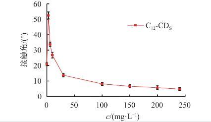 通过测试接触角评价两亲性碳点的吸附性能,接触角测定依据标准SY/T 5153—2017《油藏岩石润湿性测定方法》。具体实验步骤如下:将玻璃板浸泡在现配的食人鱼溶液(浓硫酸∶双氧水=3∶1)中1 min,进行表面羟基化的亲水处理,再洗净烘干;将玻璃板下半部浸泡在表面活性剂溶液中,上半部悬空,让溶液保持搅拌状态,浸泡12 h后取出,自然晾干。利用光学接触角测量仪(DSA100,Krüss,德国)测定表面活性剂溶液浸泡前后水滴在玻璃板上的静态接触角。玻璃的主要成分为硅酸盐,因此可用玻璃板模拟硅酸盐颗粒表面。通过测定玻璃板水滴静态接触角研究C12-CDS润滑剂在玻璃表面的吸附性能,实验结果见图3。