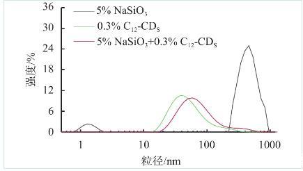 为进一步明确两亲性碳点对硅酸盐溶液的润滑机理,通过动态光散射仪(Malvern Zetasizcrnano ZS90,Malvern,英国)测定硅酸钠溶液、硅酸钠与两亲碳点和硅酸钠与聚氧乙烯型表面活性剂的混合溶液水动力学直径,其中散射角为173°,测试温度为30℃。如图6所示,质量分数为5%的Na2SiO3粒径分布在220~800 nm之间,平均粒径约为514.0 nm;质量分数为0.3%的C12-CDS溶液的粒径主要分布在8~100 nm之间,平均粒径为43.4 nm;而5%Na2SiO3+0.3%C12-CDS的混合溶液粒径为10~120 nm,平均粒径为63.2 nm,C12-CDS的加入使得Na2SiO3聚集体的尺寸大大降低,这表明C12-CDS可以让Na2SiO3聚集体解聚,这与表面活性剂对胶体溶液的分散作用相关。由于大量C12-CDS分子或胶束吸附在Na2SiO3聚集体表面形成具有机械阻碍作用的水化膜,可对Na2SiO3聚集体起到稳定分散作用。