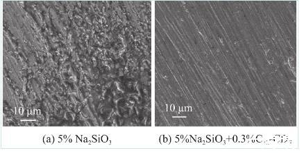 为研究两亲性碳点在硅酸钠溶液中的摩擦学性能,利用SGW-10G型杠杆四球摩擦试验机测试,测试方法参照行业标准SH/T 0189—92《润滑油抗摩损性能测定法(四球机法)》,实验参数设置如下,用扫描电镜(SEM)拍摄摩擦表面形态图片并分析如图7所示。