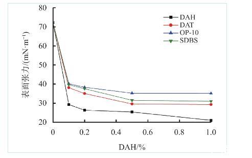 图3 DAH与常用防水锁剂对蒸馏水表面张力的影响