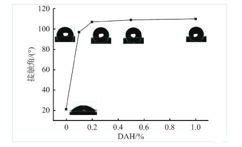 将岩心切片,使用800号金相砂纸将岩心片充分打磨,在室温下将岩心片放入不同浓度的防水锁剂DAH溶液,浸泡10 h,取出后在室温下晾干,使用OCA-25型光学接触角测定仪测定蒸馏水在岩心片表面的接触角,结果见图4。