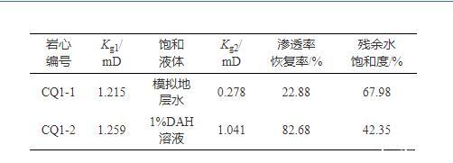 将一块岩心截为两块,测量两块岩心干态下气测渗透率Kg1,之后将两块岩心分别饱和模拟地层水和DAH溶液,使用氮气在相同压力下将两块岩心驱替至平衡,测量岩心气测渗透率Kg2及残余水饱和度,计算气驱后渗透率与干态下渗透率比值,即为岩心渗透率恢复率。如表2所示,使用模拟地层水饱和岩心后,渗透率恢复率仅有22.88%,水锁损害严重,而使用1%DAH溶液饱和岩心后,渗透率恢复率高达82.68%,水锁损害程度大幅降低,残余水饱和度更低,液相返排也更容易。