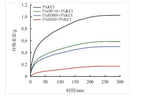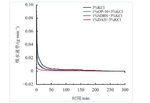 由图5可以看出,水相会在毛细管力的作用下自吸入岩心,初始阶段岩心的自吸水量较大,经过200 min后达到平衡,自吸水量不再增加;加入DAH后,岩心自吸水量下降83.1%,且相较于常用防水锁剂OP-10、SDBS效果更佳。图6同样表明,加入DAH后,岩心自吸水速率大幅降低,整个自吸过程中速率缓慢。上述实验表明,DAH可以减少因毛细管力被吸入地层的水相,从而降低水锁损害发生的风险。