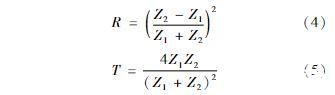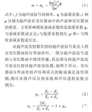 由超声波发射器发射的超声波信号垂直入射至变压器油的分界面处时,一部分超声波信号透射入变压器油中继续传播,其余部分的超声波信号垂直反射回超声波接收器,如图2所示。变压器油分界面处的声压和质点的振速满足连续原则,则可求得声压反射系数和声压透射系数分别为: