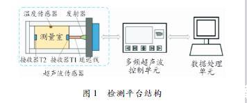超声波发射器、温度传感器、测量室和超声波发射器组成,其中位于测量室两端的2个超声波接收器用于接收在变压器油中传播的超声波信号,超声波发射器进行信号发射。为保证超声波实验检测的精度,变压器油的多频超声检测是在27.5℃的水浴恒温环境中进行的,由位于测量室的温度传感器进行监测。数据处理单元通过数字信号处理电路与多频超声控制单元进行连接,用于处理多频超声波接收模块接收到的超声波信号。经过数据处理单元处理的超声波信号,主要包括不同接收器所接收到的超声波信号的幅值、相位以及超声波信号在油中传播时的声速和飞行时间。