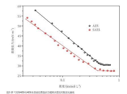 图3 25℃时SAES和AES水溶液的表面张力随其浓度的对数变化曲线