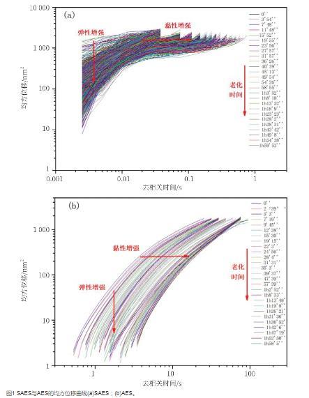 微流变可以通过跟踪粒子的布朗运动获得均方位移(mean square displacement,MSD)值测量样品的黏弹性特性。从图1中可以看出,随着样品老化时间的增加,SAES和AES的MSD曲线都是首先由长位移向短位移转变,即弹性增加,粒子间碰撞增加;去相关时间由短向长的MSD曲线变化,表明二者的黏度增加。SAES和AES在样品老化过程中,其结构都发生了变化,黏弹性都有所增加。从图1中还可以看出,SAES和AES的黏弹性差别较大,在老化过程中SAES黏弹性变化较小,而AES的黏弹性变化较大。